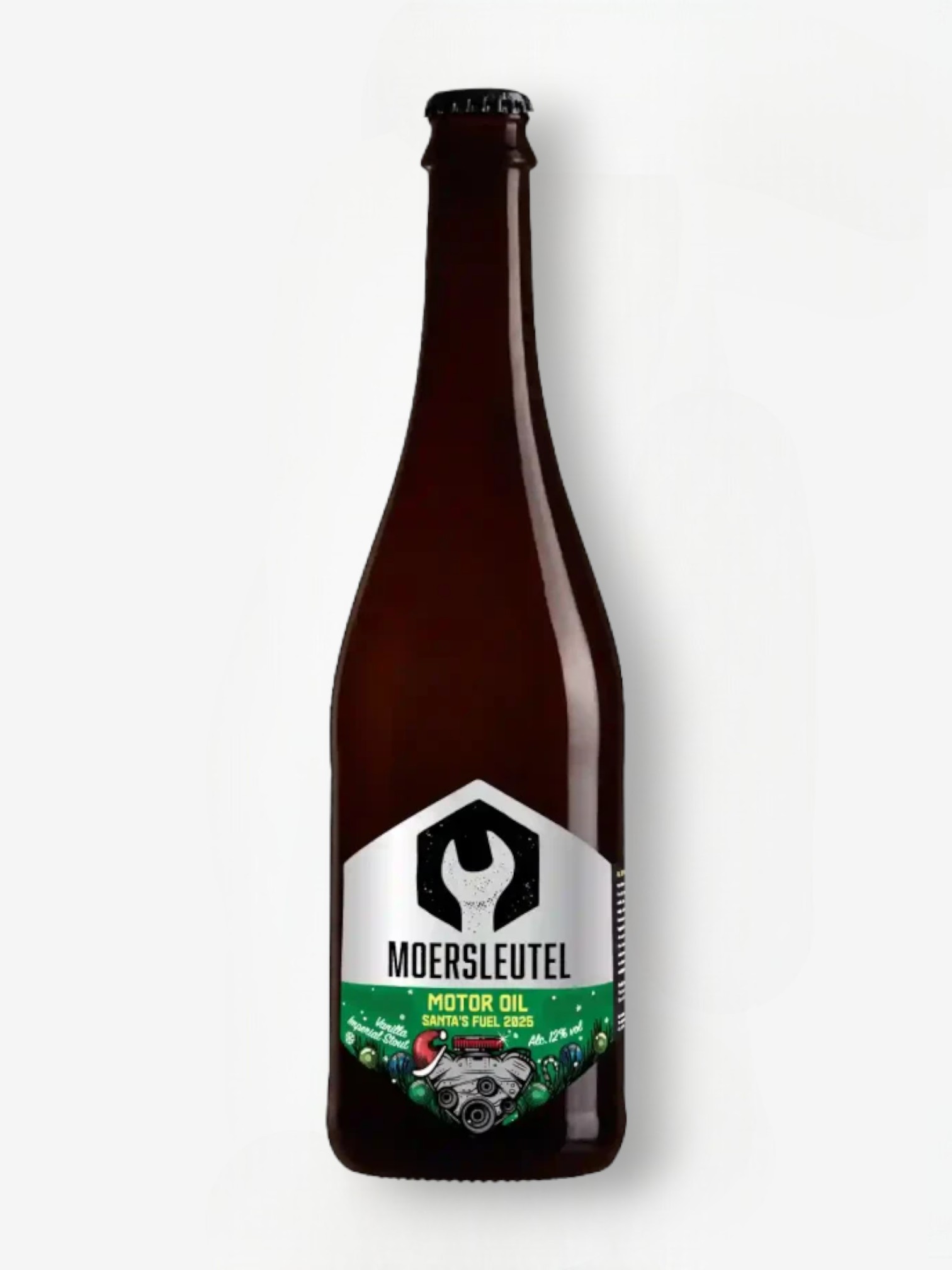 Moersleutel Santa’s Fuel 75cl – Deze exclusieve stout van Moersleutel is een echte winterklassieker: donkerzwart als een poolnacht, met een romige mokka‑kraag en een rijke, volle body. Gebrouwen met geroosterde mouten en een vleugje vanille, combineert Santa’s Fuel intense smaken van karamel, chocolade en subtiel geroosterde tonen, met een zachte, bijna dessertachtige textuur.